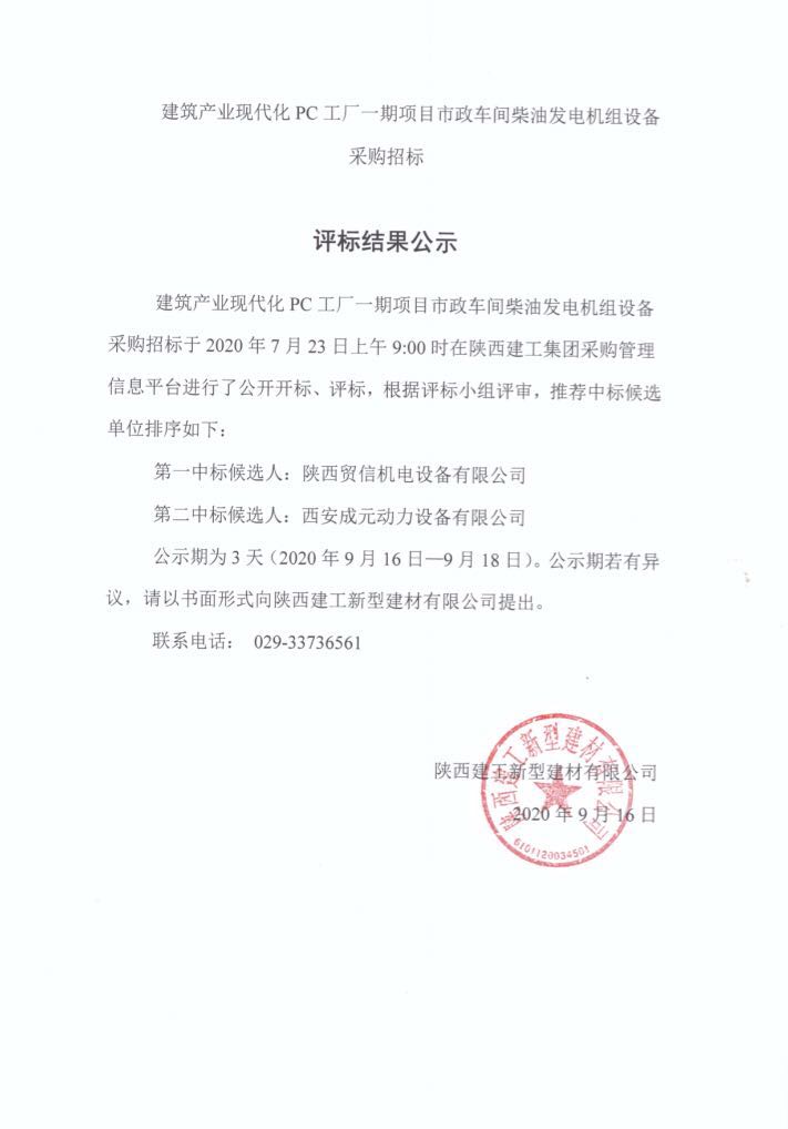 | 建筑產(chǎn)業(yè)現(xiàn)代化PC工廠一期項目市政車間柴油發(fā)電機組設(shè)備采購招標(biāo)結(jié)果公示 |