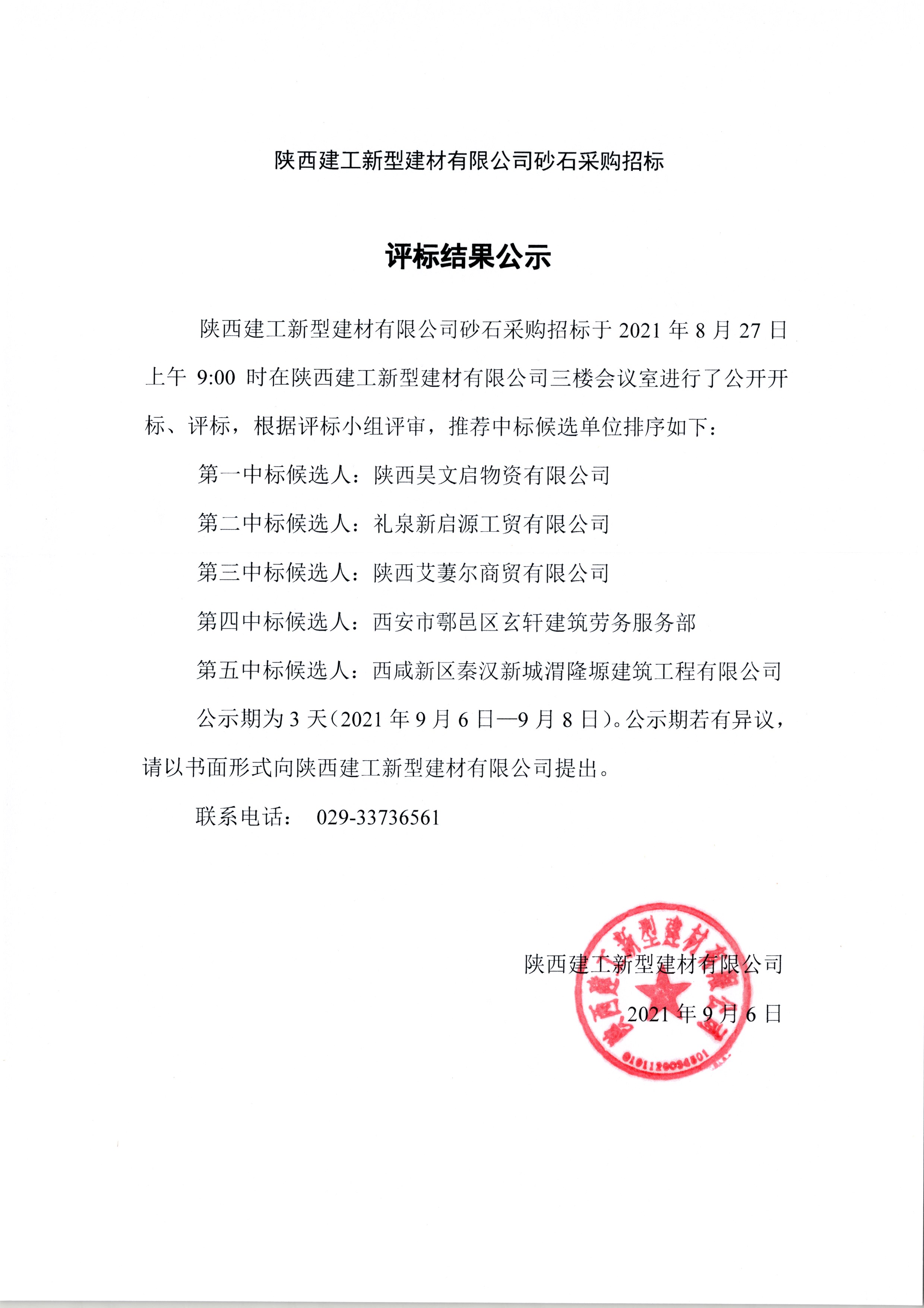 | 陜西建工新型建材有限公司砂石采購招標(biāo)評(píng)標(biāo)結(jié)果公示 |