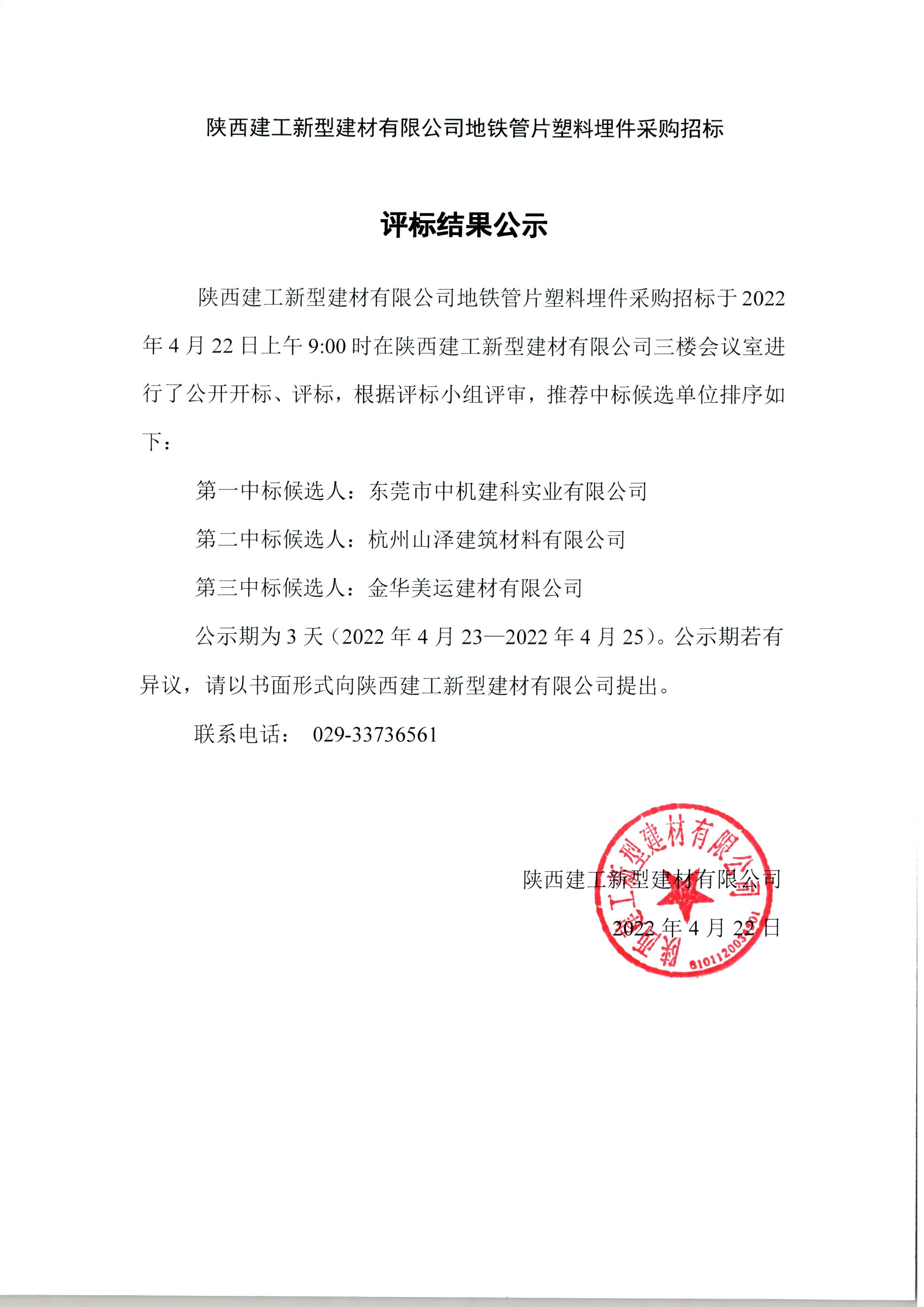 | 陜西建工新型建材有限公司地鐵管片塑料埋件采購招標結果公示 |