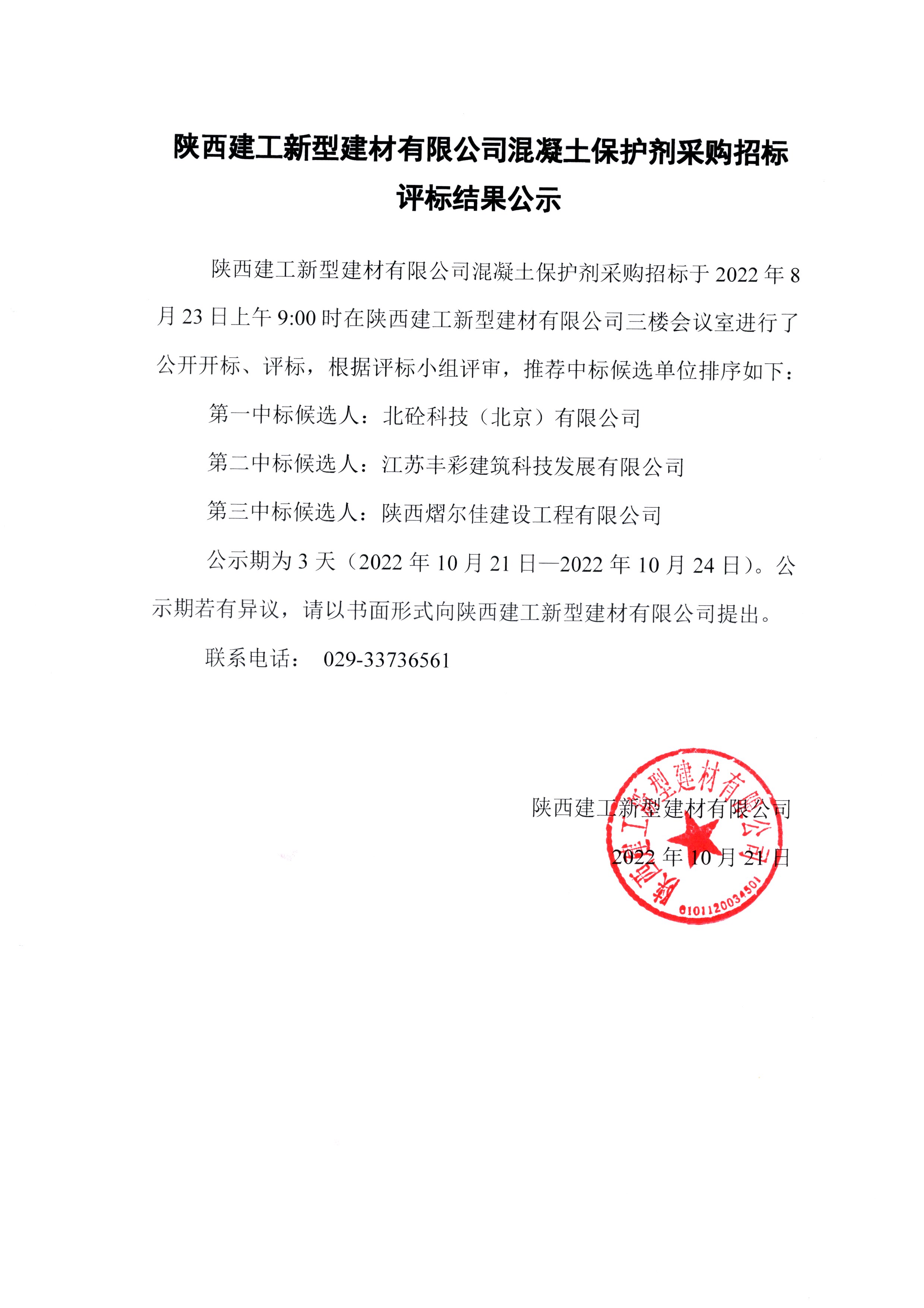 | 陜西建工新型建材有限公司混凝土保護(hù)劑采購(gòu)招標(biāo)評(píng)標(biāo)結(jié)果公示 |