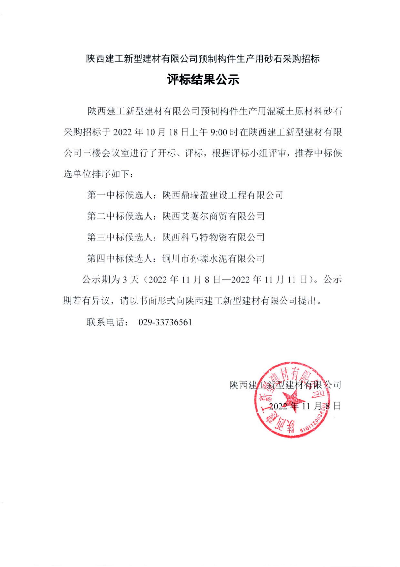 | 陜西建工新型建材有限公司預(yù)制構(gòu)件生產(chǎn)用混凝土原材料砂石采購(gòu)招標(biāo)評(píng)標(biāo)結(jié)果公示 |